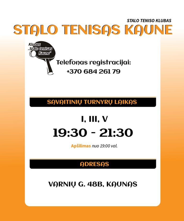 Kviečiame atvykti į stalo teniso klubo "Stalo tenisas Kaune" organizuojamus kassavaitinius turnyrus. Čia būna labai smagu! Nedvejok, registruokis ir atvyk pabandyti.